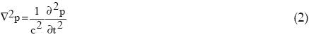 El sonido de la descarga se propaga a través de un medio de densidad (ρ) en kg/m3, a una velocidad (c) m/s, de forma mecánica, mediante el movimiento de ondas longitudinales que provocan cambios locales de presión (p) en Pascals y desplazamiento de las moléculas del medio. La ecuación de propagación de onda para campos de presión esféricamente simétricos se representa en la ecuación 2 (Kinsler et al., 2004; Blackstock, 2000) :