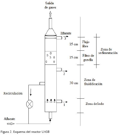 Se construyó un reactor UASB (figura 2) de forma cilíndrica de 15.2 L de capacidad (12.7 cm de diámetro y 1.20 m de altura). Se consideraron 30 cm para la zona de manto de lodos que es la zona en la que se realiza la recirculación, 30 cm para la zona de fluidificación y 30 cm para la zona de separación dividida en dos secciones de 15 cm cada una, la primera de un filtro de gravilla (0.25") y la segunda de flujo libre. En la parte superior se ensayó un cono invertido para colectar el biogás y conducirlo a una trampa de gas, para medir el volumen producido. Se instalaron válvulas a cada 30 cm para medir la dispersión de sólidos en el reactor. Los reactores anaerobios se arrancan haciéndolos funcionar con flujo continuo a valores altos de TRH y conforme se incrementa la eficiencia de remoción de materia orgánica se incrementa el gasto (Borzaconi, 2000; Kuan-Yeou et al., 2004; Ali et al., 2007; Zheng y Ho, 2002).
