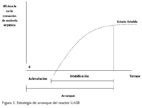 Puede considerarse que el arranque en el reactor se concluyó a los 74 días de iniciado el proceso, lo cual resulta un tiempo corto tratándose de aguas diluidas. En la literatura consultada, en general, se requieren de tiempos mayores para alcanzar la estabilización. Collins et al. (1998) alcanzaron la estabilización a los 60 días de iniciado el proceso en aguas residuales domésticas a 20°C y a 80 días cuando la temperatura del agua fue de 30°C, Elmitwalli et al. (2003) trabajando con aguas residuales domésticas obtuvieron la estabilización a los 121 días de iniciado el proceso, Florencio et al. (2001) alcanzaron la estabilización a los 200 días trabajando con aguas residuales domésticas, mientras que Ali et al. (2007), con el mismo tipo de aguas, necesitó 50 días para seleccionar el mejor inóculo, 30 días para aclimatarlo y 40 días para alcanzar el estado estable, por lo que puede concluirse que la estrategia de arranque fue adecuada.