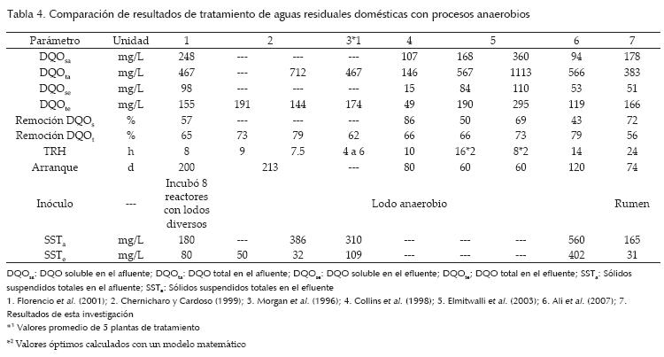 Los valores promedio de DQOta y DQOsa presentados en la tabla 4 (577 mg/L y 195 mg/L, respectivamente) son superiores a los obtenidos en el presente estudio (383 mg/L y 178 mg/L), no obstante, las eficiencias de remoción de DQOs se encuentran en el rango de las reportadas en la tabla 4, mientras que los valores de remoción de DQOt obtenidos en el estudio son menores que los valores promedio de la tabla 4. Lo anterior indica, que existe una mejor degradación de materia orgánica disuelta que de materia orgánica suspendida.