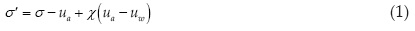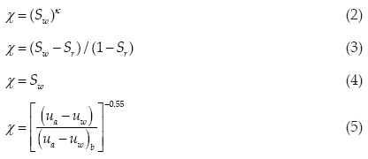 where σ ' is the effective stress, is the net stress, (σ '- υα) is the suction and X is Bishop's parameter. The product (υα - υω) represents the cohesive stress. One drawback of Bishop's equation is that a method or equation for the precise determination of the value of parameter χ has not been established. Bishop's equation was questioned because it could no predict the phenomenon of collapse upon wetting once the soil was dried and loaded above the preconsolidation pressure (Jennings and Burland, 1962). Many other equations have been proposed (Garven and Vanapilli, 2006). Some of these equations are as follows: the two first equations were proposed by Vanapalli et al. (1996), the third equation was proposed by Oberg and Sallfours (1995), and the fourth equation belongs to Khalili and Khabbaz (1998).
