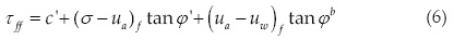 where τ ff is the shear strength; c' is the effective cohesion; (σ '- υα) is the net normal stress state on the failure plane at failure; φ' is the angle of internal friction associated with the net normal stress state variable, (σ '- υα)f;(υα - υω)f is the matric suction on the failure plane at failure; and φb is the angle indicating the rate of increase in shear strength relative to the matric suction, (υα - υω)f.
