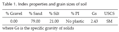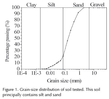 The soil used for the experimental program came from Valle de Santiago, Mexico. This soil was classified as silty sand. The grain-size distribution curve for the soil is shown in Figure 1, and its index properties are summarized in Table 1. It is noteworthy that this soil does not show any clay content.