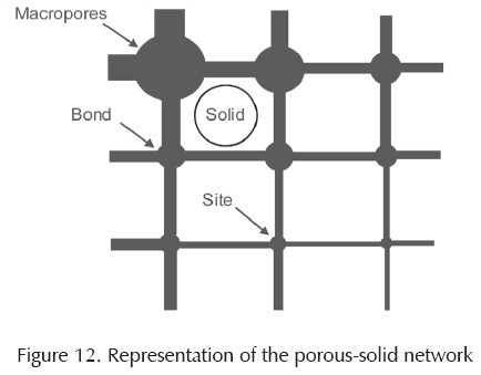 Trying to describe exactly a three-phase porous media is quite complicated, for this composition would require at least including a wide range of sizes of solids, millions of pores, their interaction with water, and the contacts between solid particles. Rojas's model is a computational tool that relates the three phases of soil and considers their behavior hydromechanical. This model is formed by four elements: sites or cavities, macropores, bonds and solids. The sites represent the pores of medium to small size. The macropores are the largest pores in the soil and differ from the sites in that the former shrink with increasing suction. The bonds are elements that link together two sites. The solid-porous model that simulates the processes of wetting and drying, is able to reproduce the hydraulic hysteresis oh the SWRC and shrinkage of the macropores. The network model can be elementarily represented in the Figure 12.