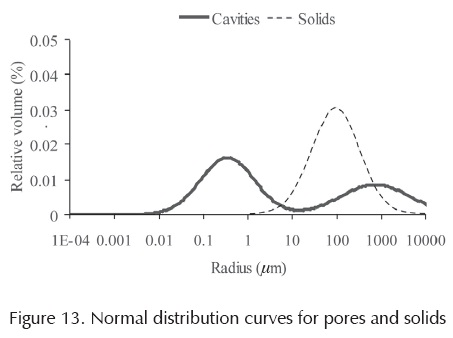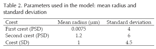 Figure 13 shows the pore distribution (PSD) used; for its proposal, the experimental observations made by Simms and Yanful (2001) were considered. They observed that pore volume related to the pore size showed two peaks. According to the above, the two peaks or crests can be seen in Figure 13. The first of these crests, the one located at approximately 0.38 μm, corresponds to smaller pores. The other crest (located at approximately 950 μm) corresponds to the macropores. The solids distribution (SD) is shown in the same figure; it presents its crest at approximately 100 μm. The parameters used for their distributions were the following:
