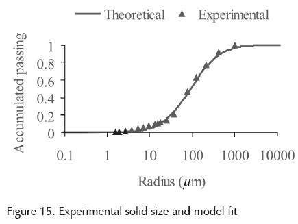 With the previous PSD model, the SWRC was determined. This curve is shown in Figure 14, the points are experimental measurements and the full line curves are fitted by the model. The size of solids experimental and theoretical distribution is shown in Figure 15. Slight differences can be observed between these two curves, especially for the larger sizes.