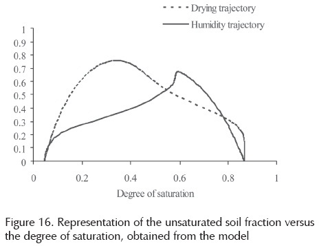 The equations to better approximate the experimental values are equations (2) and (3) of Vanapalli et al. (1996) in the wetting trajectory; in this case the values of the model are lower than the experimental values. In the trajectory of drying, the equation with values closer to the experimental values is equation (2) of Vanapalli et al. (1996) and the theoretical results of the model are closer to the experimental values from 5% degree of saturation on.
