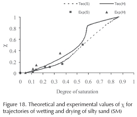 With the experimental information obtained concerning the shear strength and the porosimetry proposed, which reproduces the SWRC, it is possible to evaluate the Bishop's parameter χ using equation (10) proposed by Rojas (2008a). The theoretical and experimental results are shown in Figure 18.