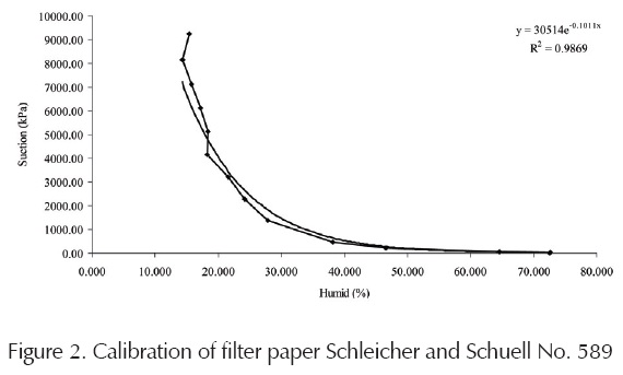 The soil was initially dried at room temperature (20°C +/- 1°C) and all particles larger than 2 mm (sieve No. 10) were removed. The remaining soil was divided in two equal parts. One half was washed using a No. 200 sieve; then both, the washed half and the unwashed half were mixed together again. Enough water was added to obtain 19.53% moisture content. The mixture was used to make soil specimens by static compaction. All specimens were fabricated in five layers. The soil for each layer was weighed (0.70 N) and placed in a cylindrical mould. Then the layer was statically compacted at a maximum stress of 3140 KPa. With these samples an experimental program was utilized to define the retention curve of wetting and drying paths, as well as the strength of the soil at different suctions following both the wetting and drying path. In order to determine the retention curves, the following procedure was applied: two sets of compacted specimens of silty sand were prepared; all samples in the first set were dried at different water contents so as to obtain the drying path. For the wetting path, all the samples of the second set were completely dried in an oven and then they were re-hydrated at different water contents by spraying varying amounts of water on them. The amount of water was controlled by using a scale. All these specimens were placed in hermetic containers and their suction was measured with the filter paper method in controlled temperature ambient (20°C + 1°C) according to the test method D 5298-9403 of the American Society for Testing and Materials (Annual book of ASTM STANDARDS, 2004). The filter paper used in these tests was the Schleicher and Schuell No. 589. This paper was previously calibrated also according to the same standardized ASTM procedure. The results of the calibration procedure are shown in Figure 2, and include a correlation equation.