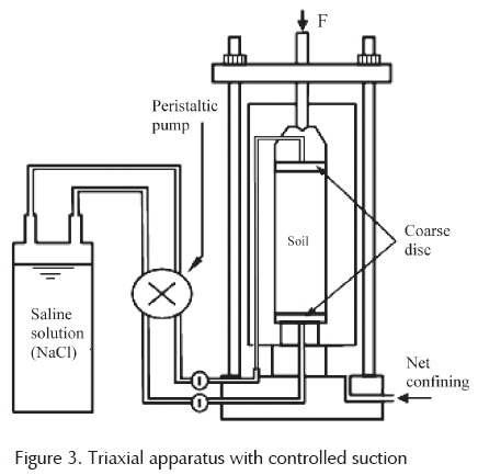 All triaxial tests were performed on samples showing the following characteristics: 50 mm in diameter and 100 mm in height, a dry density of 14.89 KN/m3 and a gravimetric water content of 19.53%. Specimens used for the wetting and drying path were prepared in the same way as those used for the retention curves. During the tests, suction was kept constant by circulating an atmosphere of a saline solution of NaCl placed in a container outside the triaxial cell. The circulation of the air was maintained by using a peristaltic pump specifically designed for fluid transfer.