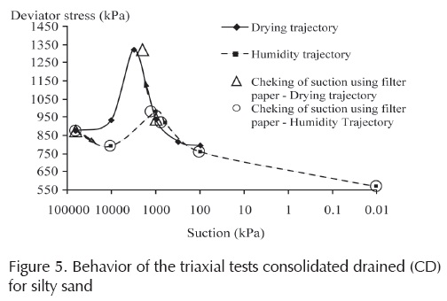 The figure shows the behavior of the resistance indicated for the deviator stress versus the degree of saturation. The arrows in the figure indicate the humidifying and drying process trajectories. Figure 5 shows the deviator stress as a function of the suction of the soil. Some values of suction were checked with the filter paper method. These graphs indicate that the deviator stress is greater during drying than wetting for suctions over 980 KPa. For suctions lower than 980 KPa this behavior is not maintained. Therefore, the way in which water distributes into the pores of the soil influences its strength.