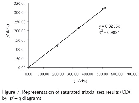 The figure shows the behavior of the resistance indicated for the deviator stress versus the suction. The arrows in the figure indicate the humidifying and drying process trajectories It was determined the angle of internal friction of soil in consolidated drained triaxial tests used for this purpose were saturated and five specimens were tested, the angle was 39.25 °, obtained graphically from the Mohr circles, shown in Figure 6. Figure 7 shows the results of those tests saturated triaxial through p'- q diagrams. In these diagrams p' is calculated with equation (12).