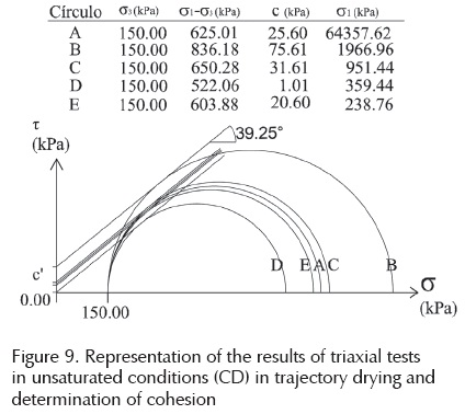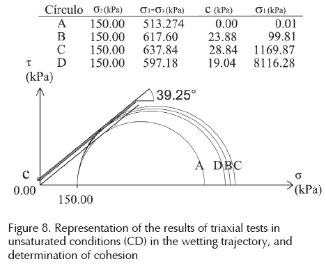Considering the angle of internal friction and the results of the unsaturated specimens shown in Figure 5, was determined the variation of cohesion with suction. For this a tangent line was searched with inclination of 39.25° in the Mohr circle for each of the specimens tested, under confinement of 150 kPa, and was projected onto the plane τ - s, thus the ordinate in this plane represents cohesion. This is shown in Figure 8 for the trajectory of wetting and in Figure 9 for the trajectory drying. The variation of cohesion with respect to the suction is shown in Figure 10.
