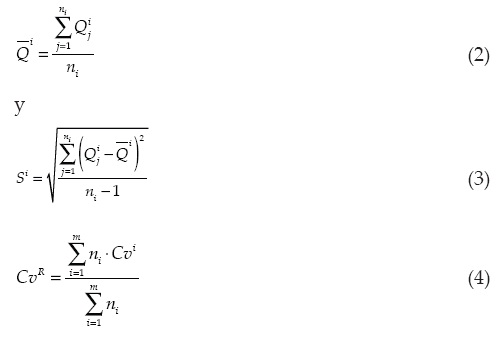 Paso 1. Se calcula el coeficiente de variación de cada sitio i (Cvi, ecuación 1) y se obtiene su promedio ponderado por las longitudes de registro ni con la expresión 4.
