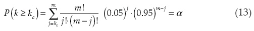En caso de querer aplicar la prueba con α = 1.0%, la única aproximación se obtiene con m = 15 y kc = 2, lo cual implica que con confiabilidad de 99% sólo en regiones con 15 o más sitios es aceptable tener kc = 2. Por el contrario, cuando en la prueba se quiera utilizar α = 10%, sus tres mejores aproximaciones se obtienen con m = 6, kc = 2, m = 11, kc = 3 y m = 18 y kc = 4; por lo cual, con confiabilidad de 90% se puede aceptar, de manera aproximada, que kc = 2 en regiones con menos de 7 sitios, kc = 3 cuando 8 < m < 16 y kc = 4 regiones con más de 17 sitios.