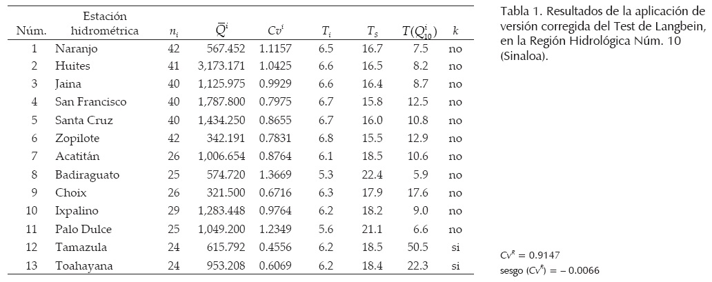 Campos (1994) presentó la información de gastos máximos anuales (m3/s) de 13 estaciones hidrométricas de la Región Hidrológica Núm. 10 (Sinaloa), cuyos lapsos de registro variaron de 1939 a 1981, con un máximo de 42 datos y un mínimo de 19. Estos gastos están asociados a tormentas ciclónicas, ya que la mayoría de tales estaciones tienen áreas de cuenca de varios miles de km2. Utilizando un periodo común de 24 años (1957-1980) se probó la homogeneidad con base en el Test de Langbein original, encontrando que únicamente la estación Tamazula debía ser excluida (Campos, 1994, 2006b).