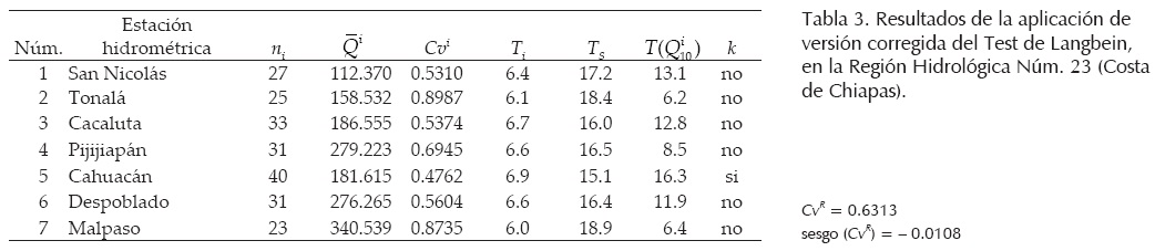 Campos (2008) ha expuesto los datos disponibles en el periodo de 1950 a 1997 de gastos máximos anuales (m3/s) en las siete estaciones hidrométricas de la Región Hidrológica Núm. 23 (Costa de Chiapas), cuyos registros varían de 23 a 40 valores. En la tabla 3 se indican los resultados de la aplicación de la versión corregida del Test de Langbein, resultando que tal región es homogénea, pues sólo la estación Cahuacán queda fuera de las curvas de control, entonces: k = 1 < kc, con α = 5.0%.