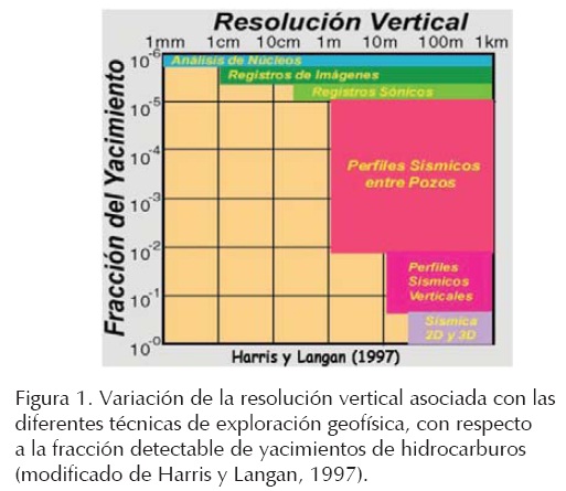 En la figura 1 se muestran las diferentes técnicas sísmicas y su correspondiente resolución vertical. Por una parte, el análisis de núcleos de roca y los registros geofísicos de pozo proveen información de alta resolución, por ejemplo, en milímetros a decenas de centímetros, por lo que estudian un volumen reducido de roca. Por otra parte, los métodos sísmicos de superficie observan un volumen mayor de roca como decenas a cientos de metros, pero con resolución limitada. Las mediciones sísmicas entre pozos pueden disminuir la brecha entre mediciones geofísicas de resolución alta y limitada (Harris y Langan, 1997).