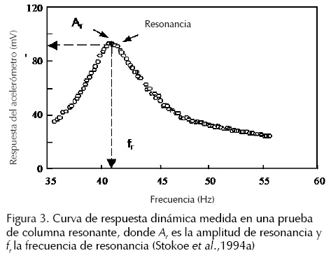 La configuración de la columna resonante (resonant column and torsional shear RCTS) para una prueba de resonancia de tipo libre-libre se ilustra en la figura 2. La frecuencia de resonancia y la amplitud de vibración se determinan a partir de la curva de respuesta. Estos valores se combinan con las características del equipo y el tamaño del espécimen para calcular velocidad de corte (VS), módulo de rigidez (μ) y amplitud de la deformación de corte, (γ).