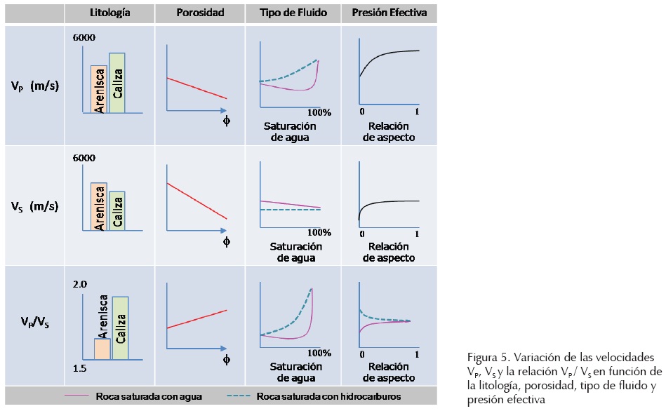 Las rocas saturadas con agua y aceite muestran valores grandes de velocidad VP porque la presencia de fluido incompresible afecta la magnitud del módulo volumétrico. Contrariamente, las rocas saturadas con gas muestran valores pequeños de velocidad por su naturaleza compresible y densidad baja. Con respecto a la velocidad VS, las magnitudes son insensibles a la saturación de fluido, ya que éstos no oponen rigidez al esfuerzo de corte. Asimismo, la velocidad VP es insensible para casi cualquier grado de saturación de agua, como se muestra en la figura 5.
