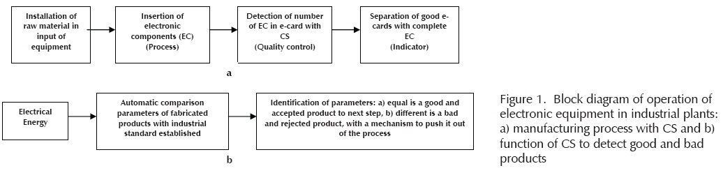 The CS are composed by electronic analog components principally, that not are protected by package systems as integrated circuits (IC) and are exposed easily to indoor aggressive environments of the electronics industry. This causes, easy and rapidly, the corrosion process in their electrical connectors and connections (ECC). Figure 1a and 1b, show the manufacturing process and operation of the CS to detect products fabricated in the electronics industry of this region, to determine if articles manufactured are accepted or rejected and to find out if the companies have economic gain or losses. A process of insertion of electronic equipment in electronic boards (e-cards) controlled by CS in the production of television and a CS in steps are represented below.