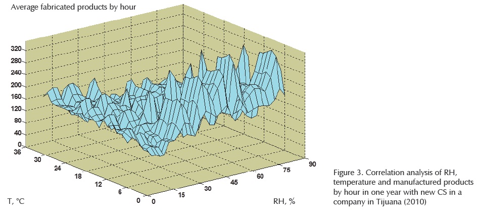Numerical analysis was made to determine the correlation of the average of fabricated products of three industrial plants in booth cities mentioned above, and the ranges of humidity and temperature at indoor conditions in the electronics industry. Figure 2 shows the minimum productivity with values of RH from 15% to 45% and temperatures less than 10°C, while the maximum productive yielding was in values of RH higher of 80% with temperatures from 20°C. Figure 3 shows too the minimum productivity with values of RH from 30% to 60% and temperatures higher to 15°C, and the maximum productive yielding was in values of RH near to 90% with temperatures less than 20°C. At low RH and temperature values, is formed a invisible thin film of water and occur the electrochemical process in some areas of ECC, and the corrosion rate (CR) was low, generating pitting corrosion, and at high RH and temperature ranges, the corrosion was high and, occurring uniform corrosion and deteriorate rapidly the ECC. The mathematical equation which evaluated the climate factors and air pollutants that increase the corrosion rate, is described as: