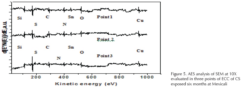 AES analyses were carried out to determine the corrosion products formed in the CS installed in the electronics industry of Mexicali and Tijuana. The Auger spectra of ECC was generated using a 5keV electron beam, which shows an analysis of the chemical composition of thin films formed in the ECC of CS (Figure 5). The AES spectrum shows the surface analysis of three points which represents the different zones of ECC. The peaks of steel appear between 180 eV, finding the sulfides. The chemical composition in the both analysis was reveled, with different concentrations of chloride, sulfur, carbon, nitrogen, oxygen, which damage the copper surface. In the analysis of Auger spectra in Tijuana that is a marine environment, the major air pollutant that reacts with copper surface was the sulphur, that occured in Mexicali. Auger spectra indicate the air pollutants combined with CO2 of the environment. Table 7 represents the atomic concentration of metallic probes with the percentages of air pollutants and carbon and oxygen.