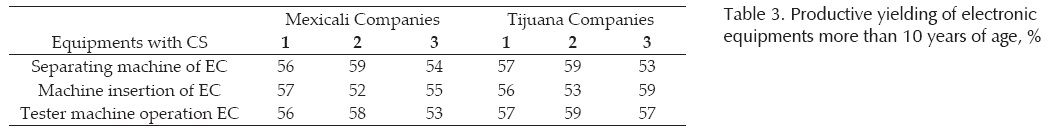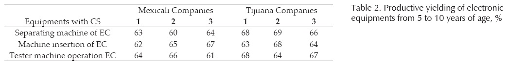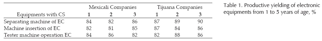 Analysis of using time of electronics equipments and machinery in the electronics industry of this city was made in relation to their production yielding. The major industrial process evaluated showed efficient operations with the use of CS, increasing the quantity of products with less mistakes. This study indicates that use of obsolete electromechanical and electronic machinery with CS is a very productive systems and companies have opportunity to economically support the improvement of each equipment and machine (López, 2008).