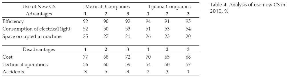 Other factors analyzed were economic, technical and health parameters with old and new control systems, to determine the productive yielding related with the efficiency, costs, organization of industrial processes and technical support. The information in Table 4 represents better conditions to save costs with good efficiency, less consumption of electrical light and space occupied of CS as advantages; and less problematic situations of use new CS respect to technical operations for use of operations manual correctly and accidents occurred by ignorance of the operation of new control systems as disadvantages.