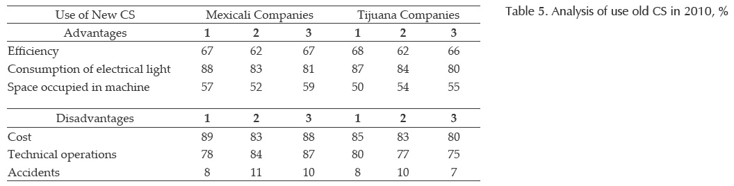 The Table 5, shows the same characteristics of Table 4, with the use of old control systems, indicating less efficiency, most consumption of electrical light and space occupied by CS, and more severe problematic situations with technical operations without operations manual, and this originated manufacturing processes unsafe, which generated more accidents in workers.