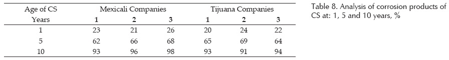 Other analysis were made to determine by periods of time the damage of the presence of tarnishing or corrosion products in ECC, and depending if the operation efficiency of CS is known, as showed in Table 8, with more presence of the corrosion phenomena when the CS was used more time.