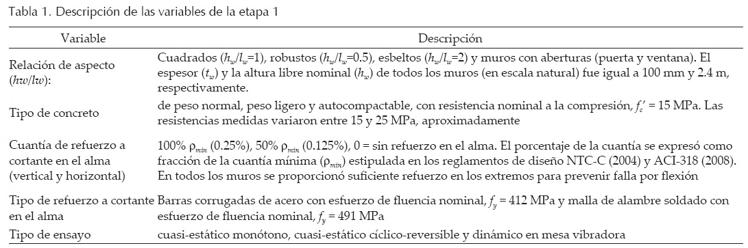 El programa experimental de la primera etapa incluyó 39 ensayos cuasi-estáticos y dinámicos de muros con diferente relación de aspecto y sistemas de muros con aberturas (Flores et al., 2007; Carrillo, 2010; Sánchez, 2010).