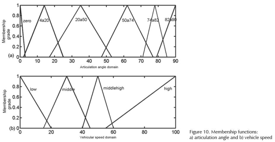 Figure 10 shows the example of two membership groups: a) articulation angle, with six linguistic variables to represent all the angle values: Zero, 4 to 20, 20 to 50, 50 to 74, 74 to 82 and 82 to 90; as an example 4 to 20 means that the value is between 4 and 20 degrees, considering zero degrees when the tractor and the semitrailer are aligned or in angles between 0 and 4°, and b) vehicular speed, with four linguistic variables: low, middle, middle-high, and high, both articulation angle and vehicular speed will be used to feed the fuzzy angle estimator in order to calculate the angle of the steering axles.