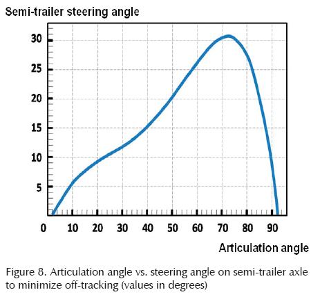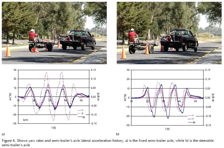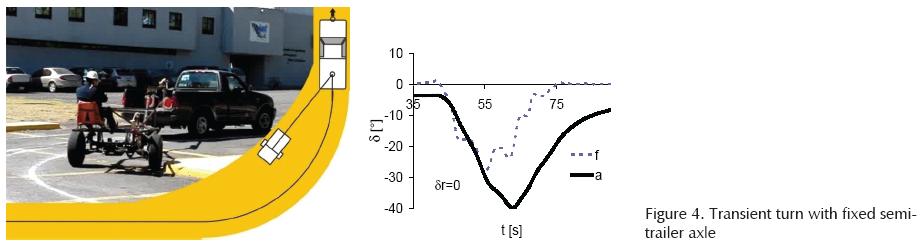During previous tests on full scale vehicles (Figure 7) and from the Ackerman equations, the angle in the semi-trailer axle that would minimize the off-tracking for each radios turn were geometrically calculated This defines the general behavior required for the specific semi-trailer dimensional configuration.