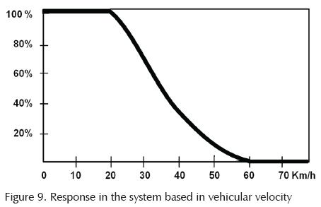During the testing, there was some experimentation with certain parameters that could minimize potential stability loss, for example, consider vehicle's speed. These defined behaviors would apply during maneuvers at lower vehicular speeds and, as speed is increased, the system's angle of the steering axle of the semi-trailer should decrease proportionally, to the point were the system will be set to null response at speeds higher than 60 Km/h (Figure 9).