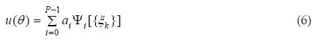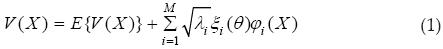 donde E{V(X)} representa la esperanza matemática del campo aleatorio; ξi(θ ) son las coordenadas de realización del campo aleatorio con respecto a un conjunto de funciones deterministas φi y forman un conjunto de variables aleatorias no correlacionadas con media cero y varianza unitaria; λi y φi son los valores y funciones característicos de la función de autocovarianza, definidas a su vez, por la solución de la ecuación integral, cuya forma es