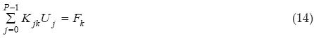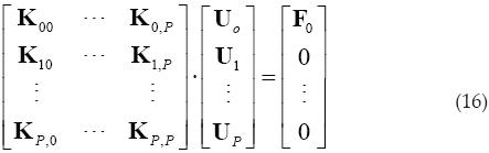 La ecuación (14) establece un sistema de ecuaciones lineales con dimensiones N.P x N.P, donde N está determinado por el número físico de grados de libertad en el modelo de elemento finito y P por el número de coeficientes que se utilizan en la expansión en caos polinomial, dicho sistema se expresa como: