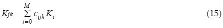 La ecuación (13), que representa la ecuación de equilibrio estocástica global, es una función de la base polinomial sobre el espacio de funciones de Hilbert; donde Fk= E{Fψk} es cero si k > 0 para cargas deterministas y E{ξj ψj ψk} es la esperanza del producto de dos polinomios y una variable aleatoria (Sudret y Der, 2000; Dumitriu et al., 2007), denotada por cijk. Agrupando términos en la ecuación (13), se tiene finalmente que la ecuación de equilibrio estocástica es