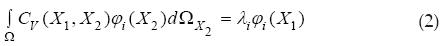La ecuación (2) se conoce como ecuación integral de Fredholm homogénea de segundo género, en la cual el núcleo CV (X1,X2), está definido por la función de autocovarianza, que es real, simétrica y positiva; X1 y X2 son las coordenadas espaciales. La solución de la ecuación integral puede ser obtenida analítica y numéricamente; ambas soluciones fueron propuestas por Ghanem y Spanos (1991) para el caso de campos aleatorios Gaussianos.