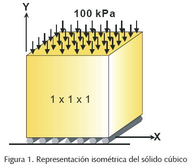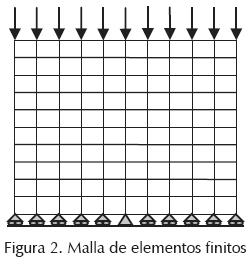 Se considera un sólido cúbico de dimensiones unitarias (1x1x1 m), constituido de un solo material con módulo de deformación aleatorio, sometido a presión vertical de 100 kPa. Los apoyos en el extremo inferior restringen el movimiento verticalmente; el central, lo restringe también horizontalmente. En la figura 1 se observan estas condiciones. El análisis se realiza suponiendo en primera aproximación que prevalece un estado de esfuerzos planos. Se evaluará la incertidumbre en los desplazamientos horizontales y verticales con el MEFEE. Para realizar el análisis, el cubo se discretizó con una malla de 100 elementos, la presión se representó como cargas puntuales aplicadas en los puntos nodales superiores de la malla, como se muestra en la figura 2.