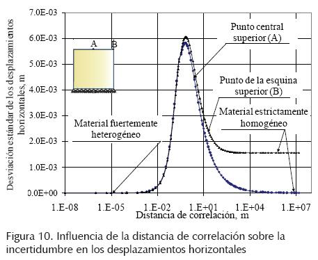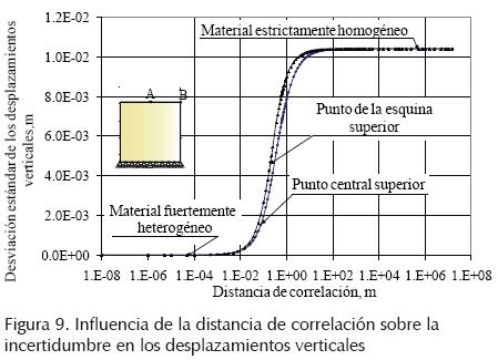 La variabilidad del desplazamiento vertical para el centro superior del cubo (punto A) en función de la distancia de correlación se muestra en la figura 9. Para distancias de correlación pequeñas, la incertidumbre (desviación estándar) sobre este desplazamiento es nula; tal resultado se debe al efecto de compensación estadística ya mencionado, debido a que el material es fuertemente heterogéneo (ruido blanco) pero estadísticamente homogéneo. Conforme la distancia de correlación aumenta, la incertidumbre crece y se presenta una incertidumbre mayor para el punto A que para el B, hasta alcanzar la magnitud de la incertidumbre impuesta en el módulo de deformación, cuando el material se vuelve estrictamente homogéneo.
