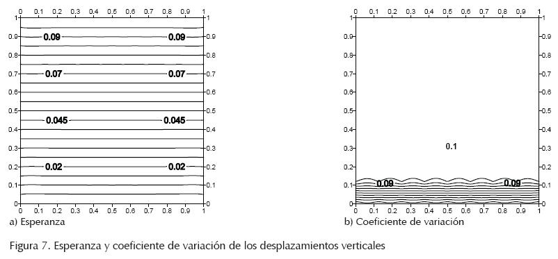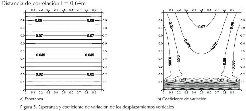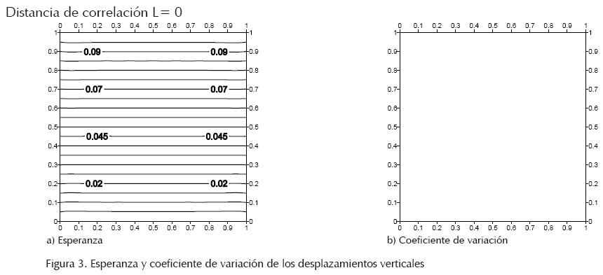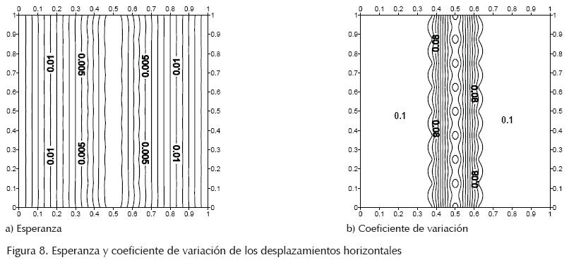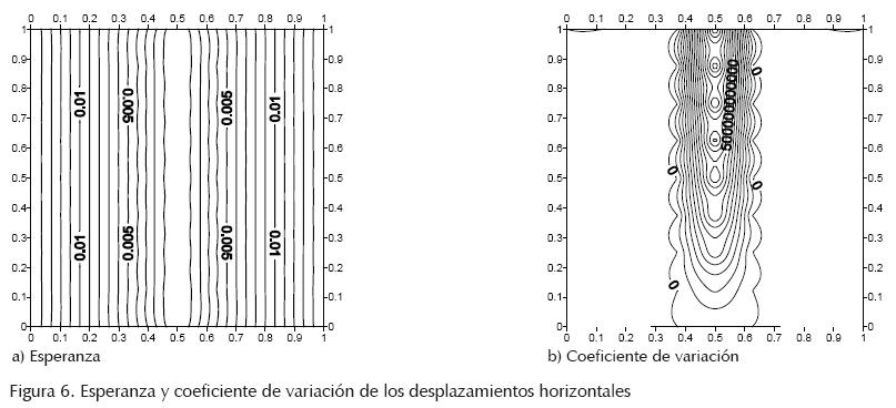 En este segundo análisis, la distancia de correlación (0.64m) es ligeramente inferior al ancho del sólido (1m). La figura 5b muestra que, como debía esperarse, la incertidumbre sobre los desplazamientos verticales es nula en la parte inferior del sólido, donde el movimiento fue restringido. En el resto del sólido se observa que la incertidumbre no es uniforme debido al efecto de promedio espacial o compensación estadística. Por ejemplo, la incertidumbre en el punto superior central es menor que en el punto superior de la esquina del sólido debido a que el número de materiales "puntuales" con baja correlación que interactúan es mayor en el punto central que en el de la esquina. Por otra parte, en la figura 6b se observa cómo el CV de los desplazamientos horizontales tiende a infinito sobre el eje de simetría; en este caso, el comportamiento del material es fuertemente heterogéneo lo que da lugar a que se presenten variaciones aleatorias alrededor de su valor esperado (que es nulo), originando una incertidumbre relativa infinita sobre tal eje.