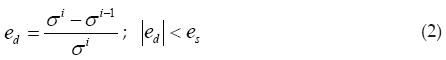 donde el i se refiere al refinamiento actual, i-1 al refinamiento previo y así sucesivamente. Este procedimiento de verificación de convergencia ha mostrado ser efectivo para problemas de contacto (Sinclair et al., 2002). Se considera que el criterio descrito por la ecuación (1) es preferido sobre otros donde solamente se comparan resultados de 2 refinamientos sucesivos. En conjunto con la equación (1), se considera cubierto el criterio de convergnecia si se cumple que la diferencia de discretización (ed) es menor que el error predefinido (es). En análisis de esfuerzos se considera el nivel de exactitud como: es=1% es excelente, es=5% es bueno, y es=10% es satisfactorio (Beisheim y Sinclair, 2008). El error estimado de la discretización en refinamientos sucesivos se calcula con la ecuación (2).