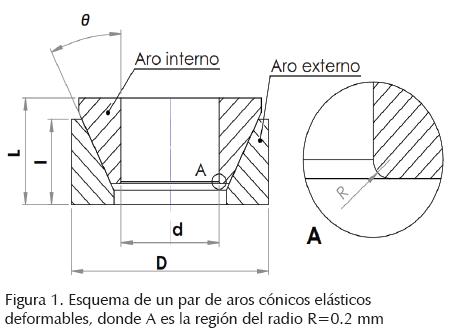 La unión mecánica considerada es una flecha-cubo de rueda con un par de aros cónicos en la interfaz de unión. La figura 1 muestra un esquema del par de aros, su geometría corresponde a Ringfeder RfN S8006 20x25 mm, los cuales tienen longitud axial (L) de 6.3 mm, longitud axial de aro (l) de 5.3 mm, ángulo de conicidad (0) de 16.7°, diámetro externo (D) de 25 mm, diámetro interno (d) de 20 mm, y ajuste E7/f7. En el modelo discreto la geometría del cubo de rueda corresponde a un engrane ondrives G3-25, con diámetro interno de 25 mm, diámetro externo de 50 mm, longitud axial de 50 mm y ajuste H8 en el agujero. La flecha del modelo discreto se considera maciza de longitud axial igual a la del cubo, diámetro externo de 20 mm y ajuste h6.