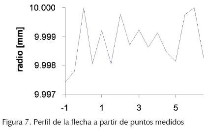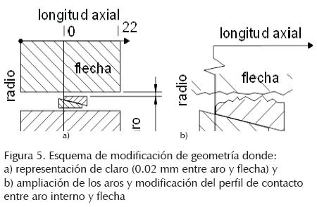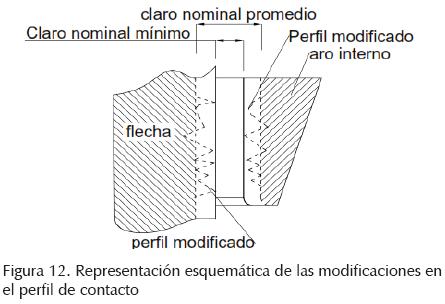 Previamente se estableció el radio mínimo del aro interno en 10.020 mm. Con el objeto de tomar en cuenta las incorporaciones de las modificaciones del perfil (figuras 8 y 9), se modifica el radio nominal del aro interno a 10.021 mm (aún dentro de su región de tolerancia), para evitar que al adicionar las modificaciones al perfil se rebase la región de tolerancia. De forma análoga para la flecha, su radio máximo es de 10 mm y se modifica a 9.999 mm. Con esa consideración se logra que las modificaciones en el perfil de la superficie de contacto sean mayor al radio mínimo del aro interno y menores para el diámetro de la flecha, correspondientes al ajuste E7/ h6 (figuras 8 y 12).