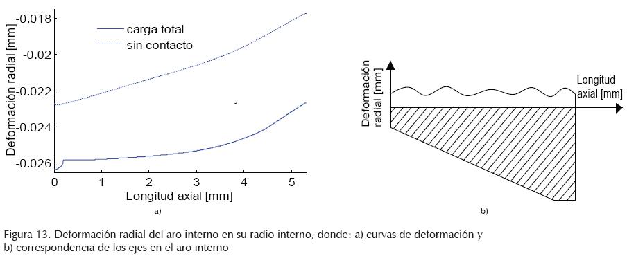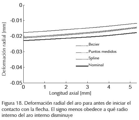 Si se considera nuevamente la esquematización de la figura 12, es claro identificar la diferencia de radios para los perfiles con interpolación de los puntos y el perfil considerado como nominal modificado. Los cambios adicionados con esa variación de radios de contacto generan que la deformación para iniciar el contacto y la deformación al final de la carga total aplicada se modifique. En la figura 18 se muestran las curvas de deformación radial del aro interno para una diferencia de carga antes de iniciar presión de contacto en la flecha. Como se esperaba, la curva que presenta la mayor deformación radial es la correspondiente a la geometría nominal, ya que ésta presenta un radio inicial constante en todo el aro interno. Como se representa en la figura 12, el claro en esa configuración es mayor que en las aproximaciones donde existe variación de radio de la región de contacto. En la figura 12 se indicia que el calor nominal de 0.02 mm se incrementa para permitir modificar las superficies de contacto, y que éstas se mantengan dentro de la zona de tolerancia. Como se observa de la figura 18, para todas las aproximaciones de superficies el primer contacto ocurre alrededor de 0.02 mm y se modifica por la aproximación que se hace en cada caso (figuras 8 y 9).