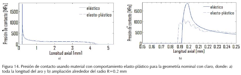 La ubicación del radio R de 0.2 mm en el aro, región A de la figura 1, corresponde a la ausencia de contacto cercano al origen (figura 4). En la región del primer contacto (cerca del origen) se presenta el pico de esfuerzo de contacto, como consecuencia de la discontinuidad que se aprecia de la geometría del aro interno (figura 1) y la ampliación del pico de esfuerzo en la figura 4. En el extremo grueso del aro interno, dada la magnitud de la fuerza axial de pariete (18 kN), no se logra contacto en toda su longitud axial (Szwedowicz y Bedolla, 2007). El contacto del aro se termina aproximadamente a 5 mm del origen, que corresponde a la proximidad del extremo grueso del aro interno.