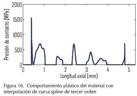 Los resultados obtenidos en las pruebas de convergencia de malla, indican que los picos de esfuerzos de contacto para la geometría nominal superan el límite elástico (figura 4) para materiales estructurales. Tomando en cuenta esa característica, para las simulaciones con los modelos discretos que incluyen claros y modificación del perfil de la superficie de contacto, se incluye comportamiento elástico y plástico con endurecimiento del material. Para aproximar el comportamiento plástico se usa la ecuación (3) y las propiedades del acero AISI 1045, que son: módulos elástico (E) 205 GPa (Matweb, 2010), límite elástico (σys) 310 MPa y coeficiente de endurecimiento de 0.1736 (Ozel y Zeren, 2006). Los resultados de la ecuación 3 se presentan en la figura 10.