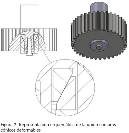 Para simular el proceso de ensamble de la unión mecánica se restringe el movimiento axial a un aro, y al otro, se le aplica fuerza de compresión en dirección axial, que incrusta un aro en el otro. Esto genera deformación radial en ambos aros y se logra el contacto entre las piezas. La resistencia portante del ensamble es función de la fuerza de apriete axial aplicada a los aros, ya que la deformación radial de los aros se relaciona con la presión que ejercen sobre el cubo de rueda y la flecha. En la práctica, la restricción de movimiento generalmente se logra con una modificación del diámetro del cubo o de la flecha (figura 2), generando un asiento para un aro.