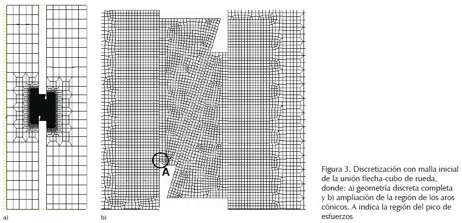 En la discretización de la unión, para el proceso de refinamiento de malla y simulación de esfuerzos de contacto con la interpolación de las curvas medidas, Bezier y spline, se usan elementos axisimétricos CAX4 (Abaqus, 2010). La malla en las regiones de contacto se refina sistemáticamente dividiendo en 4 nuevos elementos a cada elemento del refinamiento previo. Fuera de la región de contacto de la flecha y aro interno, se conservan los elementos usados en la discretización inicial.